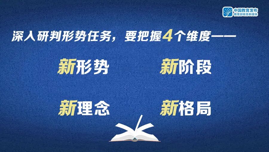 一是新形势。深刻认识人民群众对公平优质教育的需求日益强烈,决定了今后教育发展的主要内容;世界百年未有之大变局加速演变的趋势,决定了今后中国教育走向世界、教育对外开放的主要任务;在全球治理和国际规则制定中主要矛盾的表现形式,决定了今后参与教育国际治理的突破方向。